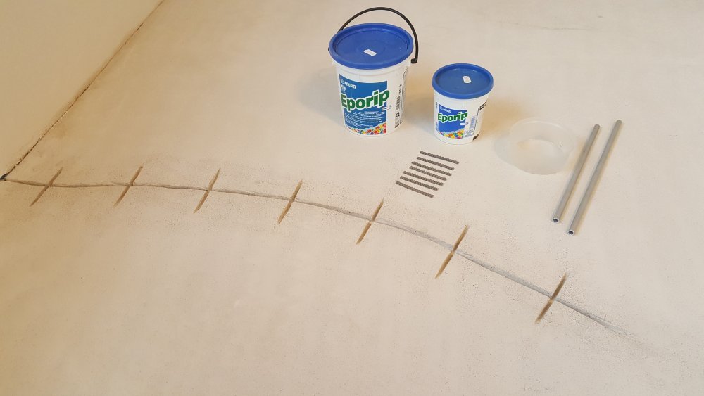 Jak to opravit? Prasklina se v celé délce prořízne diamantovým kotoučem a to do hloubky cca. 30 mm. Po-zor na podlahové topení pokud tam je (většinou by mělo být 40 mm pod anhydritem). Pak se provedou kolmo na prasklinu prořezy (tak aby tam zapadlý kovové spony) a provede se zalití vysprávkovou směsí. Po zalití ještě posypte směs jemným křemičitým pískem. A je hotovo. Takto opravená prasklina již nikdy nepovolí.