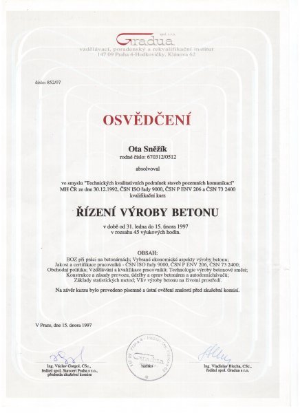 Působíme na českém trhu již více než 15 let. Předtím jsme se profesionálně zabývali od roku 1997 výrobou a distribucí betonů viz. Osvědčení o řízení výroby betonu.