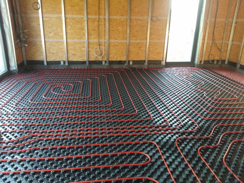 - Pokud je podlahové topeni, tak je na podlaze opět provedena separační vrstva formou systémové desky, nebo systémového pásu s rastrem (roll-jet). Dále je po obvodu stěn připevněna obvodová dilatace dostatečně vysoká a to nejméně 2 cm nad anhydritovou podlahou a tloušťka musí být nejméně 10 mm.